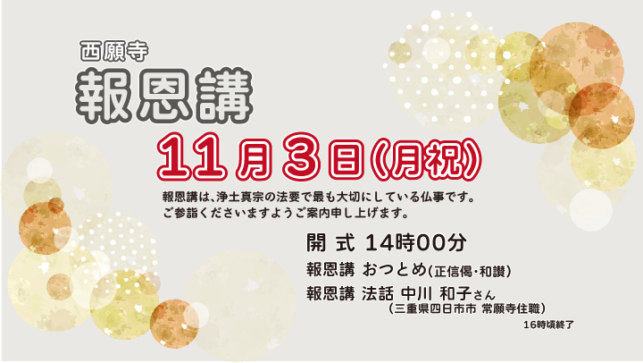 報恩講とは、宗祖親鸞聖人が仏教の教えを顕らかにされ、私たちに「念仏 (南無阿弥陀仏)の教え」を届けてくださったご恩に報いる法要であり、真宗門徒が最も大切にしている仏事です。西願寺では、毎年11月上旬に勤めています。報恩講の「おつとめ」をはじめ、講師の「法話」、「御絵伝の絵解」等がございます。是非とも、ご参詣くださいますようご案内いたします。