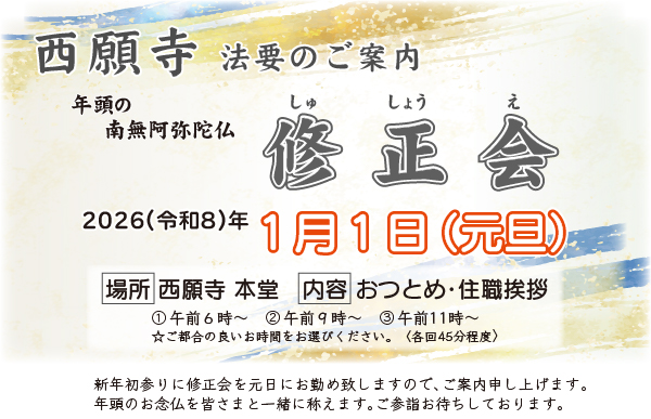 西願寺では下記のとおり「修正会」をお勤めしますので、ご参詣くださいますようご案内申し上げます。